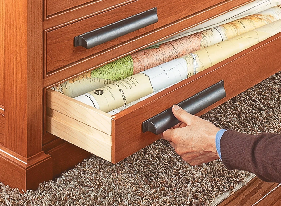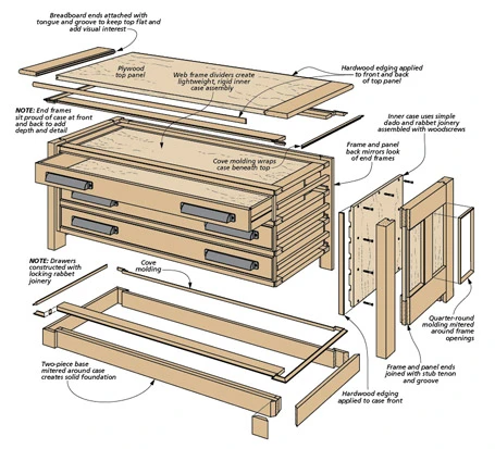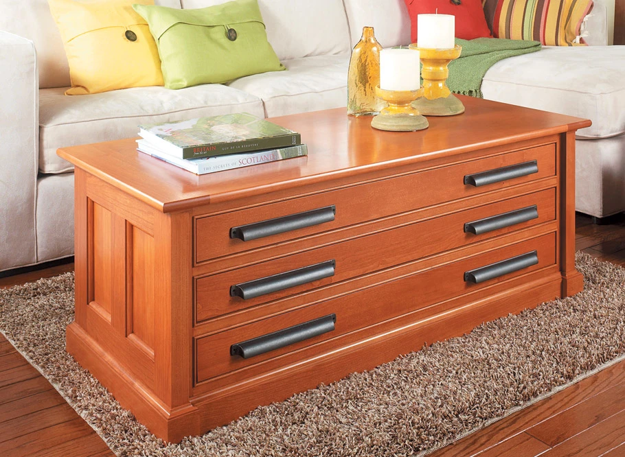 This design is loosely based on tall chests of narrow drawers used to store maps. But a change in scale creates a project that combines handy storage with a spacious coffee table. Despite the impressive appearance, you’ll find that your time in the shop is pretty relaxed. In essence, the case is a plywood and web frame shell that’s “skinned” with a frame and panel exterior. This simplifies the work by letting you make and add the exterior details individually. There’s no harrowing “one shot” case assembly. Just take it leisurely and look forward to the end result.