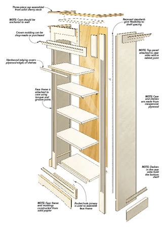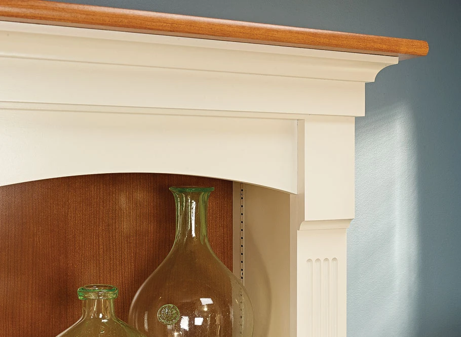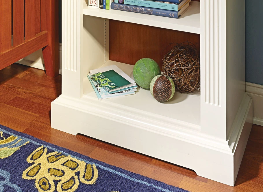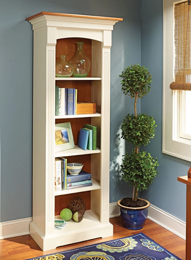 With this beautifully designed bookcase you can see how some small details and the right molding treatments can take an ordinary bookcase and make it look special. The first thing that catches your eye is the two-tone finish. While the top cap and back panel have a cherry finish, the rest of the bookcase is painted. This allows inexpensive poplar lumber to be used on the face frame and moldings. The stiles on the front of the case have evenly spaced stopped flutes. We’ll show you how to make them in the shop with a handheld router and a simple-to-build jig.