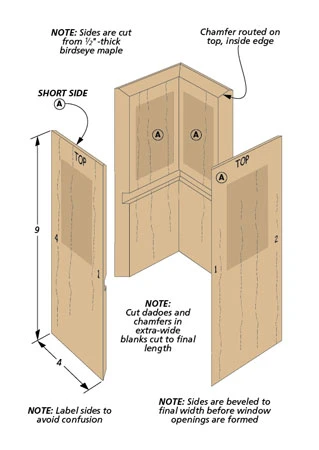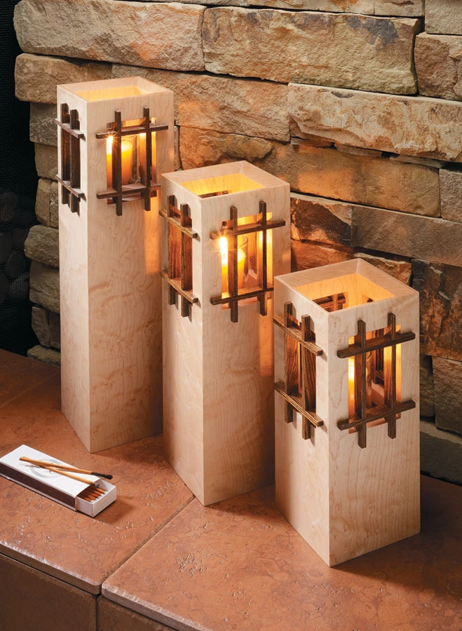 At first glance you notice the stylish details of these candle holders — the contrast between the figured maple of the bases and the dark hardwood of the window grilles, and how the configuration of the grilles adds interest to the window openings. What’s easy to miss is all the woodworking that goes into building the stands. It begins with the miter joints used to assemble the bases and continues right through the half laps used to make the window grilles. We guarantee you’ll get your fill of quality shop time, with an impressive project as the proof.