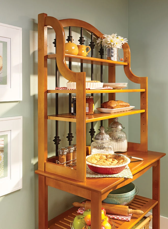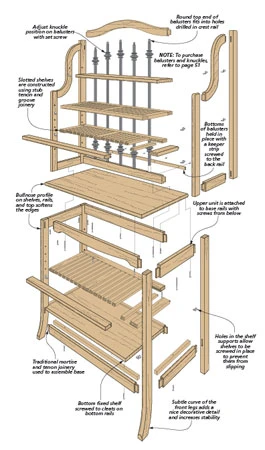 Whether you use it to cool your pies and fresh-baked bread, or just to store your food processor, toaster, or some other kitchen appliance, it’s a handy piece of kitchen furniture. It’s also a great project for picking up a few new woodworking skills, like incorporating interesting metal balusters into your furniture. On top of that, there are a lot of curved parts that call for special consideration when it comes to creating the joinery. But we’ve broken everything into easy-to-learn segments.