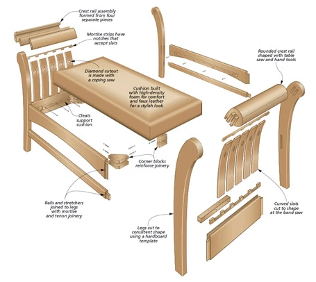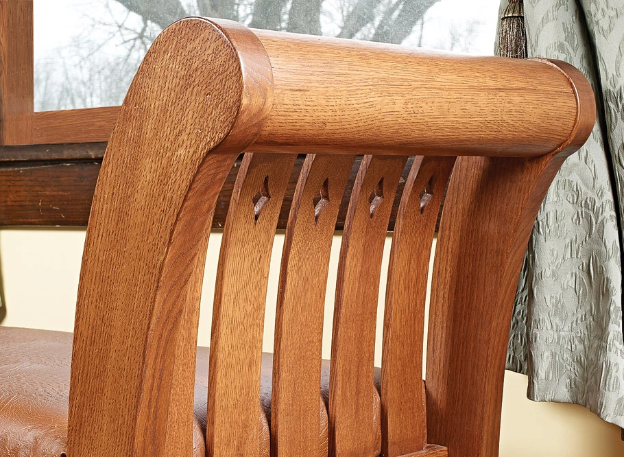 Known for its tall, graceful arms with sweeping curves, the empire bench gained its name due to its popularity among European rulers in the 17th, 18th, and 19th centuries. This version of the classic bench features many of the same notes as the traditional ones — elegant lines, gentle curves, and time-tested construction — but with a more down-to-earth design that’ll look great in your home, even if it’s not a palace. The bench has a stout, sturdy appearance due to the use of thick,quartersawn white oak throughout. And rock-solid mortise and tenon joinery ensures that the bench will stay together for the long haul. Of course, the first element that likely draws your eye are the end assemblies. With curved legs and slats and rounded crest rails at the top, they certainly lend a distinctive look to the bench.
