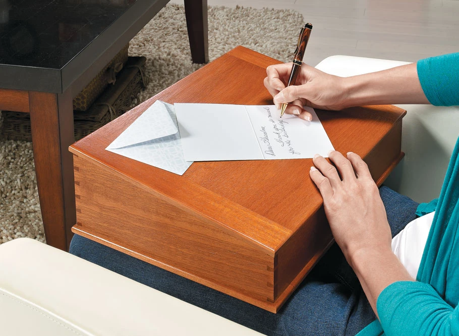 Do you know someone who loves to write handwritten letters on nice stationery? Those writers deserve some special attention in return. Modeled on examples of antique lap desks, this modern version should prove every bit as useful. The hinged top opens to reveal plenty of storage for paper and stamps. It even has a small drawer on the side for pens or other items.