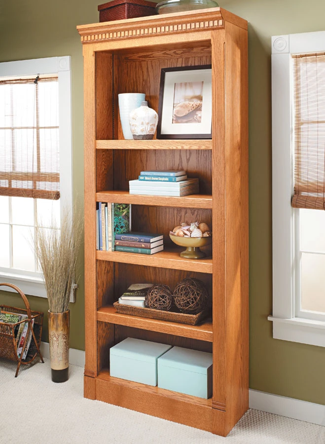 This bookcase has all the good looks of a quality piece of furniture, but we’ve simplified the construction to make it easier to build. Plinth blocks, dentil molding, and other details ensure that you’ll get plenty of compliments. Because the case and shelves are all cut from plywood, you’ll be off to a running start. And there’s no complicated joinery, which makes the work go even faster. Pocket hole screws hold the case together and are used to assemble the face frame and back panel for a quick build. The shop-made trim is flush with the sides of the case, so additional bookcases will fit together to look like one unit when standing side-by-side.