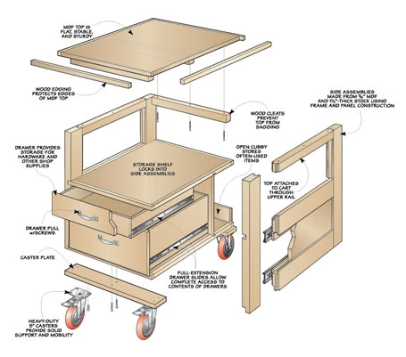 Regardless of the workout you give this cart, when you’re ready to “roll on” to the next task, you won’t have to worry about spilling a load of workpieces. That’s because the cart rolls on large, heavy-duty casters that won’t get hung up on extension cords, floor cracks, or wood chips. A pair of drawers at the front of the cart and an open shelf at the back means often-used supplies will always be close at hand.