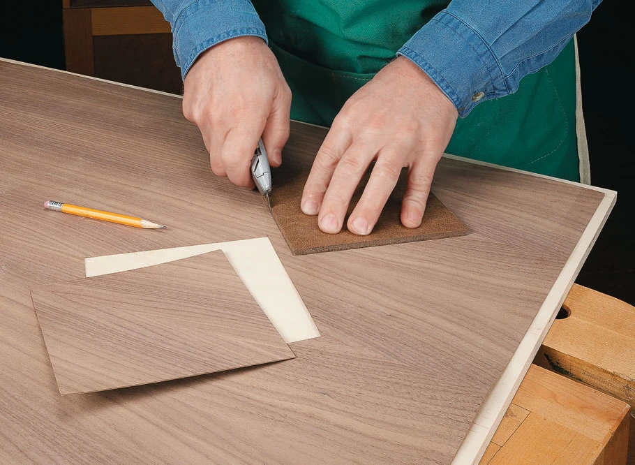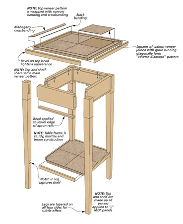 At its simplest, building a small table involves nothing more than joining four legs to apron rails and then adding a top. But as you can clearly see, the construction of this attractive accent table is anything but a run-of-the-mill job. The mortise and tenon frame of the table is really pretty standard — four tapered legs and a “beaded” apron. Making and adding the pattern veneered top and shelf is where the interesting and fun challenge lies. The top and shelf also add a slight twist to the construction. The shelf is captured in notches in the legs during the frame assembly. This means that the shelf has to be completed and fit before the frame can be glued up.