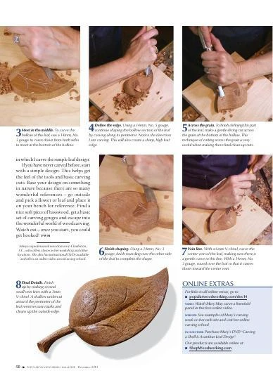 Mary May will teach you the basics on how to transfer designs to wood, use templates, and find a good set of tools. She will then walk you through the steps to carve a simple leaf to utilize your new-found knowledge.