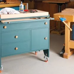 Workbench space shrinks quickly once you factor in the tools, plans, and other supplies you need close to hand while working. And wouldn’t it be nice to have extra space for assembly, too? Answering all these points leads to the origin of this project. Now I realize that a shop cart isn’t groundbreaking. In fact, every one who works in the Woodsmith shop has a cart (or two) parked close by. What makes this one unique is how its size and features play into the role of a workbench companion. You know, that trusted sidekick every hero has. The primary feature is the extra acreage supplied by the top. And there are two options: a workbench-like solid wood surface or a more basic rimmed top. A pull-out tray supplies another surface for when shop time is in full speed. Putting the space below the top to use makes practical sense. So three drawers and an enclosed compartment organize and divide the area for versatile storage.